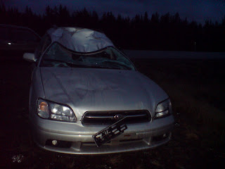 Nåja tog mig ut till stora vägen mellan älvdalen och lillhärdal och nån km till ..sen kom en 90graders kurva som ja inte lyckades fullt ut att mästra i 50 km/h... Började att ta rätt fram å ja vre om å gav gas å bad till 4hjulsdriften att hjälpa, och de gjorde den när vi nådde en liten liten gruskant vid dikeskanten, Tvärkast på bilen och gick i sidled längs vägen men sakta sakta glidandes mot det motsatta diket och jo mycke riktigt så gled vi ner.