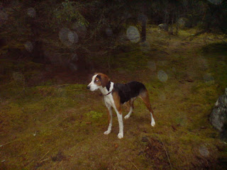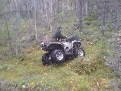 Sen for jag upp på ett annat område och skulle kolla till hur mycke dom håller på å skövla i skogen, så då fick lillstövarn hänga me å få lite friskluft, de blev inge upptag men han hitta ett påbörjat gryt å några slag som va aningens för gamla. Men han fick iaf ut å lufta husse lite, de e de som räknas. (ni får ursäkta den suddiga bilden men han va lika gla som mig å få va ute i skogen...)