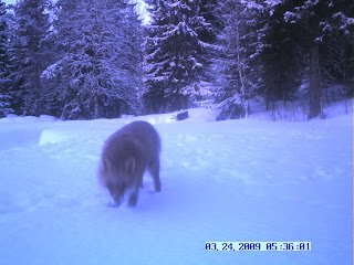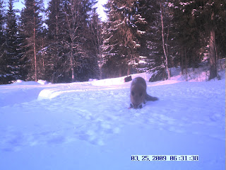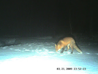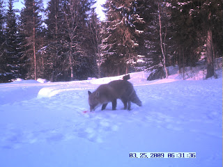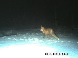 Sen ja satte ut kameran så har det inte vare nått fram till åteln...så jävla typiskt...Men så igår natt så börja hunnan å bli orolig inne vi halv 5 på morron.....kuta till fönstret i vardagsrummet och gnällde sen till sängen för å få upp mig ....fram å till baks i ca 20 min till ja va tvungen å kliva upp å kika....men ja såg inget.....Jaja tänkte ja att ja får väl se på kamera imorrn va de va...Inte ett kort taget....va faan... så ja tog å gick fram till åteln och jo kameran tog 2 kort....Ahha nu vet ja, klart som faan kamera inte tog nå kort när puckot som bor här ha vare snäll å skotta fram till åteln så rävjävlarna kan gå som i en tunnel helt obemärkt fram till åteln.....så in å hämta litte gotta å kasta ut uppe på djupsnön mer framför kamera.....och TADA en liten mickel fotograferad direkt....