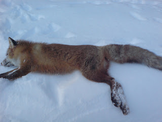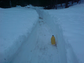 Men den rackarn vände när han mötte den nya grand canyon som bildats av ett stycke snöslunga och skurit av stigen dom använder för att gå fram till åteln......ett stycke in efter denna canyon så är det nu en krater där fällan snart ska stå...sedan fortsätter ravinen en liten bit och avslutas med en juste ramp (avfasad snö som fungerar som en handikapramp anpassad efter alla tänkbara EU mått för rullstolsburna rävar). Om allt går som de ska så får jag tag i laddaren till skruvdragarn imorrn och kan börja monterandet av ett stycke fälla.....målet är sedan att fånga minst en innan den 15 apr...